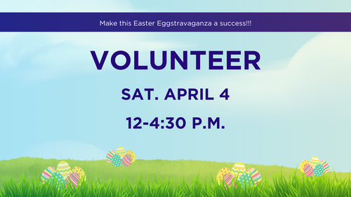Get ready to make Easter unforgettable at our Eggstravaganza on April 4! We need volunteers from 12:00-4:30 p.m. to help create a fun-filled afternoon for families.