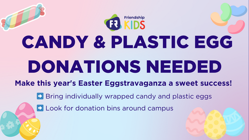 Help us make this year’s Easter Eggstravaganza a blast for the kids! We’re collecting donations of plastic eggs and pre-wrapped candy to fill them, and donation bins are placed around the church campus for easy drop-off.